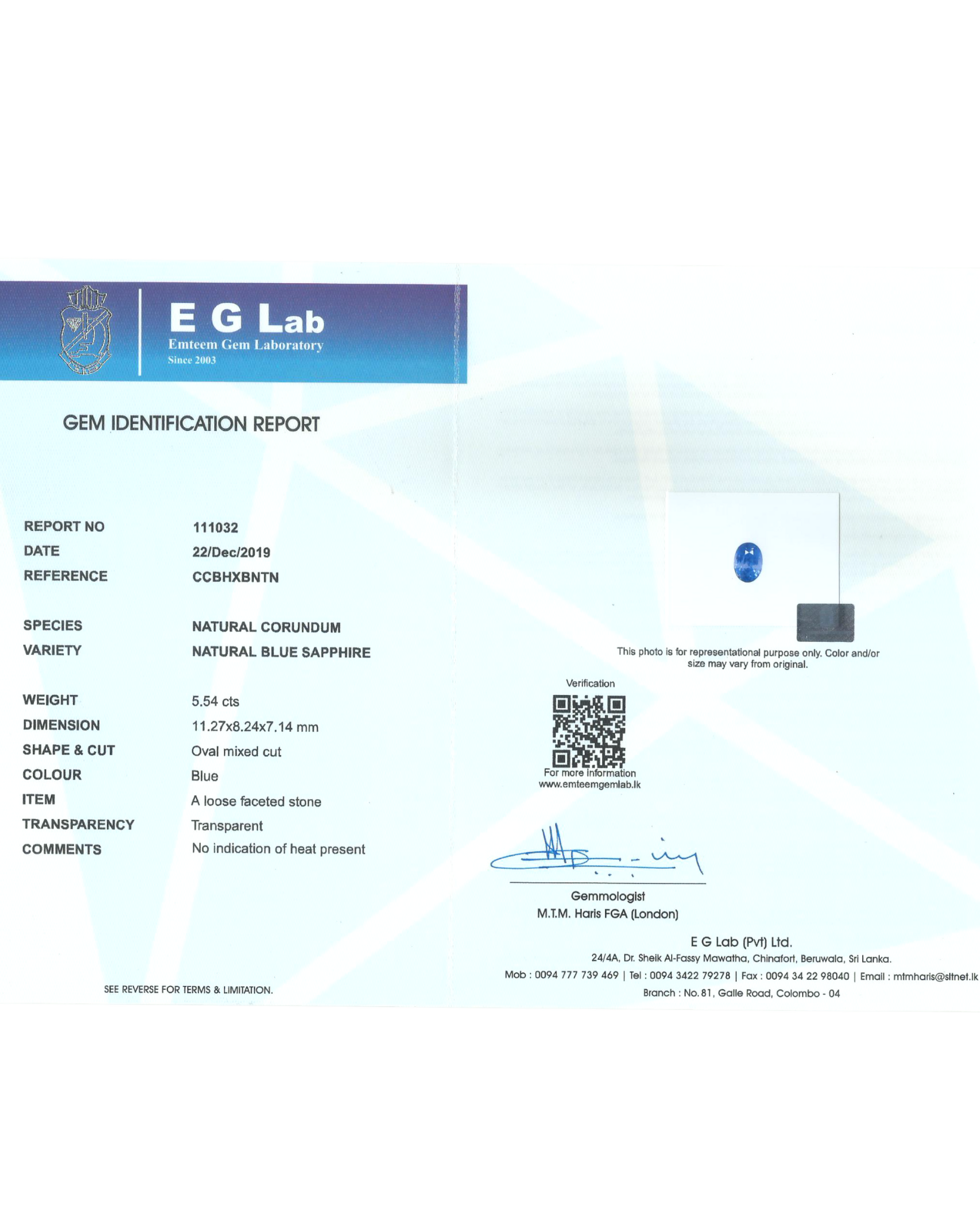 EGL Certified 5.54 Ct - 6.15 Ratti Natural Unheated Ceylon Blue Sapphire - Neelam