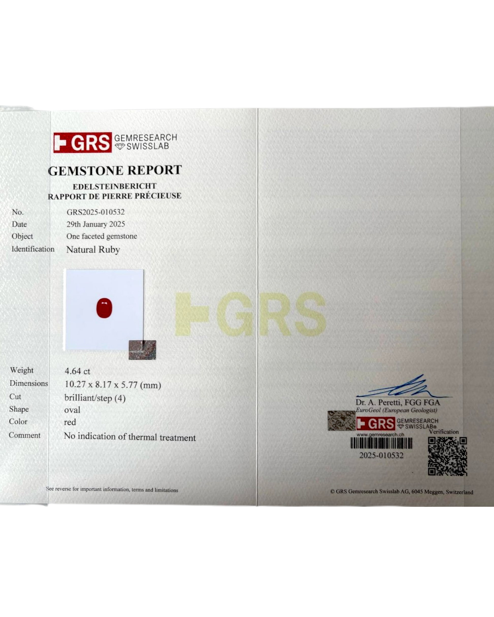 This Natural, Unheated & Untreated Ruby is certified by GRS Swiss Lab, one of the world’s most prestigious and trusted gemological authorities.