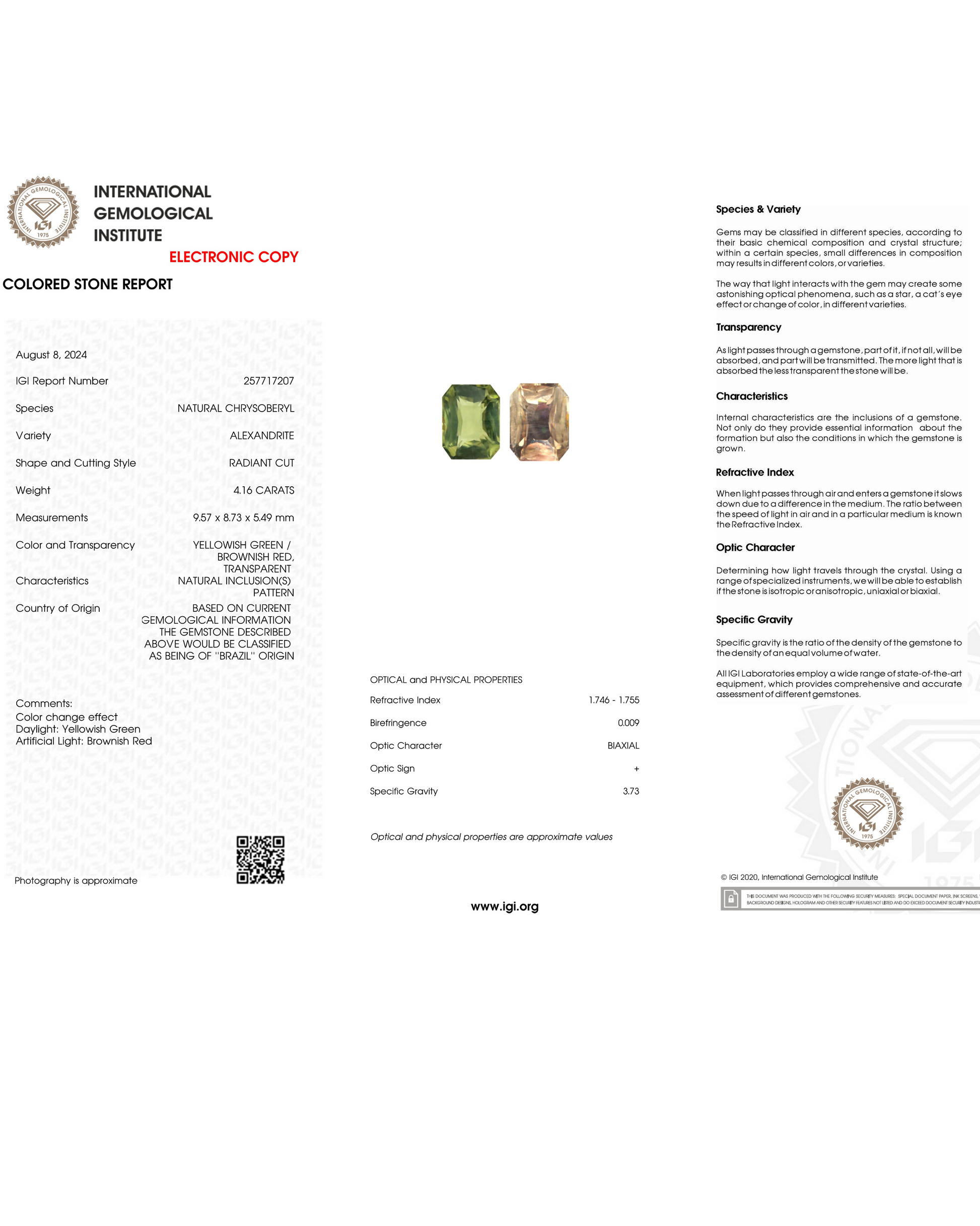 IGI Certified 4.16 Ct Natural Brazil Alexandrite