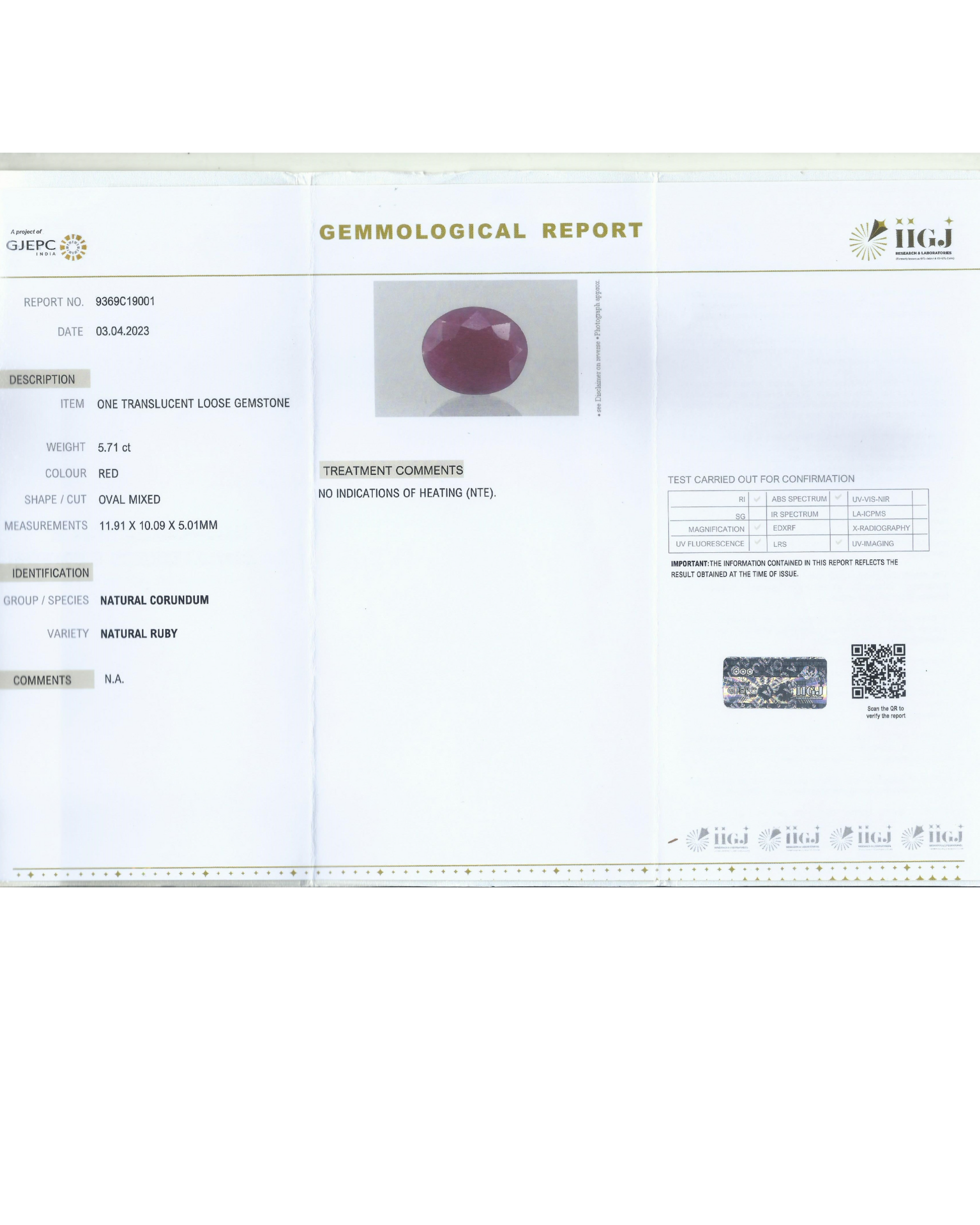 IIGJ Certified 5.71 Ct - 6.34 Ratti Unheated Untreated Natural Ruby Manik