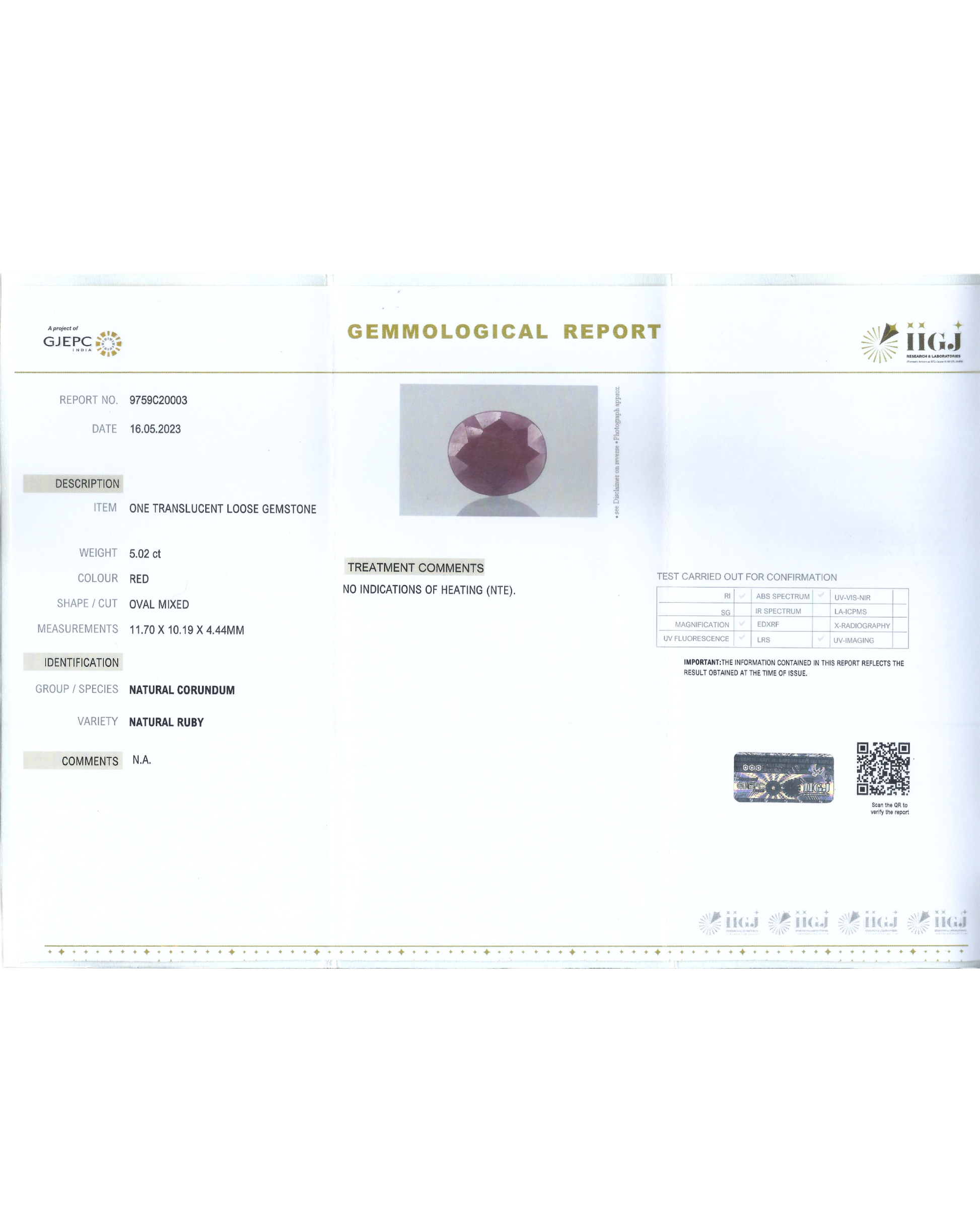 IIGJ Certified 5.02 Ct - 5.57 Ratti Unheated Untreated Natural Ruby Manik