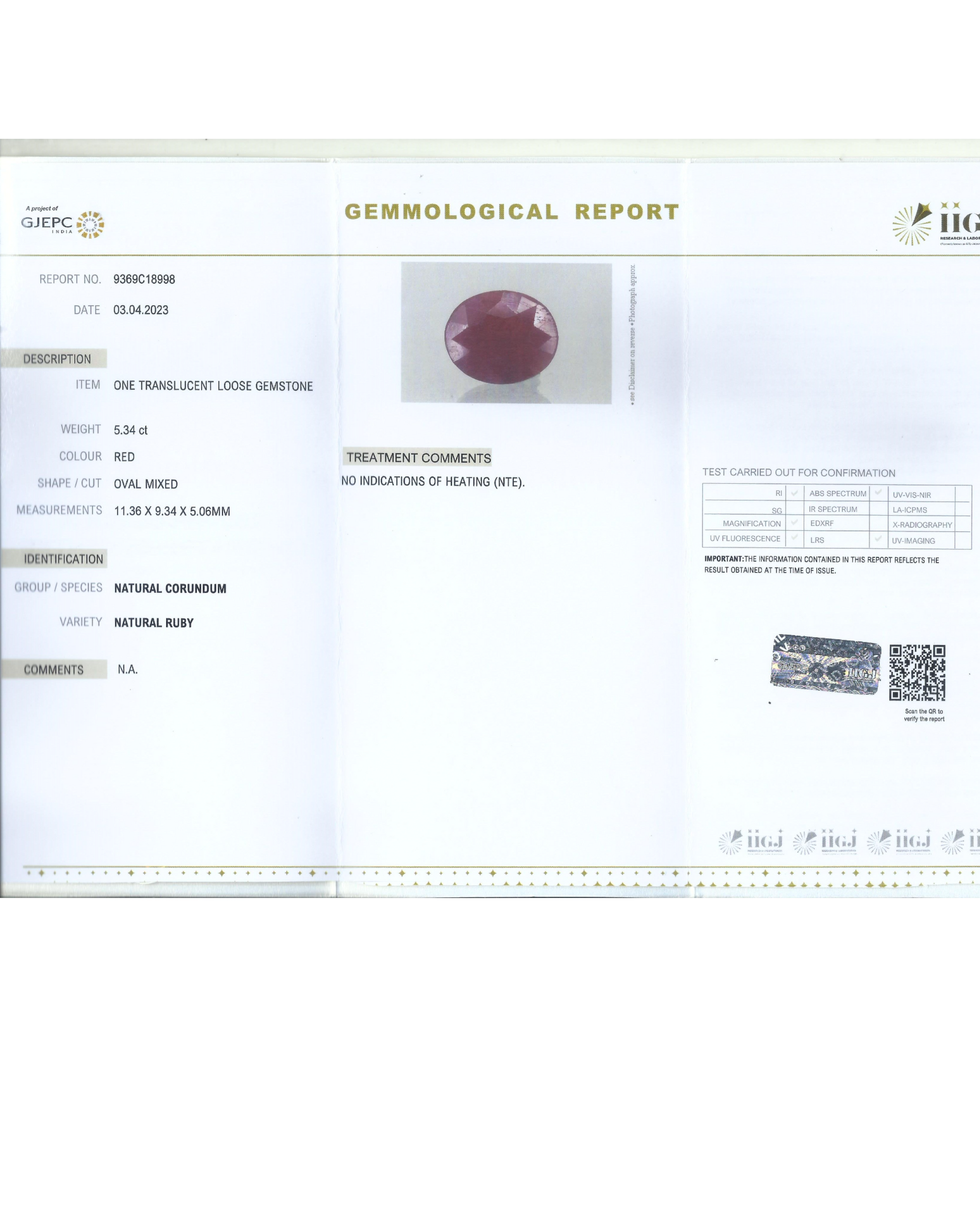 IIGJ Certified 5.34 Ct - 5.93 Ratti Unheated Untreated Natural Ruby Manik