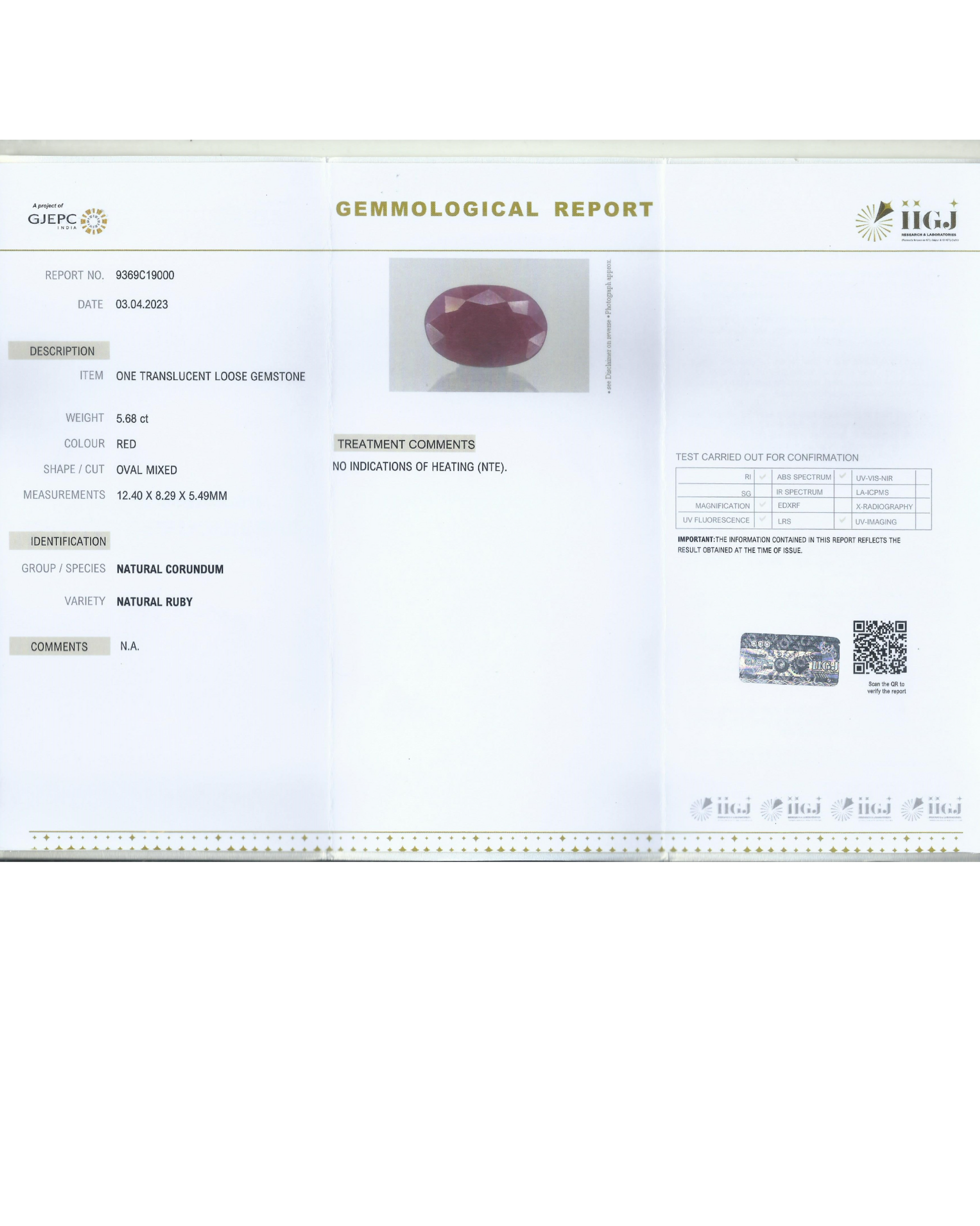 IIGJ Certified 5.68 Ct - 6.31 Ratti Unheated Untreated Natural Ruby Manik