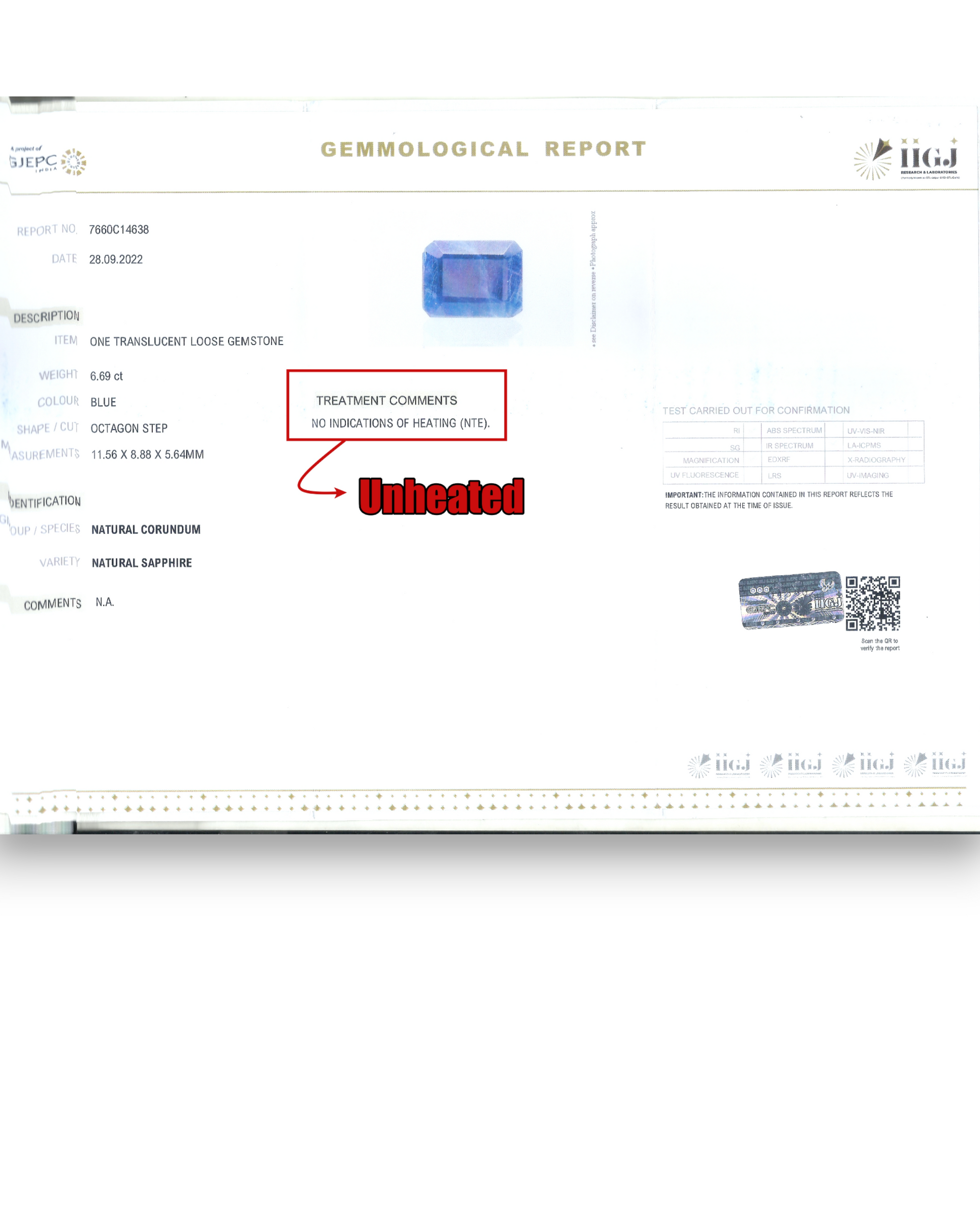 IIGJ Certified 6.69 Ct - 7.43 Ratti Natural Unheated Blue Sapphire-Neelam